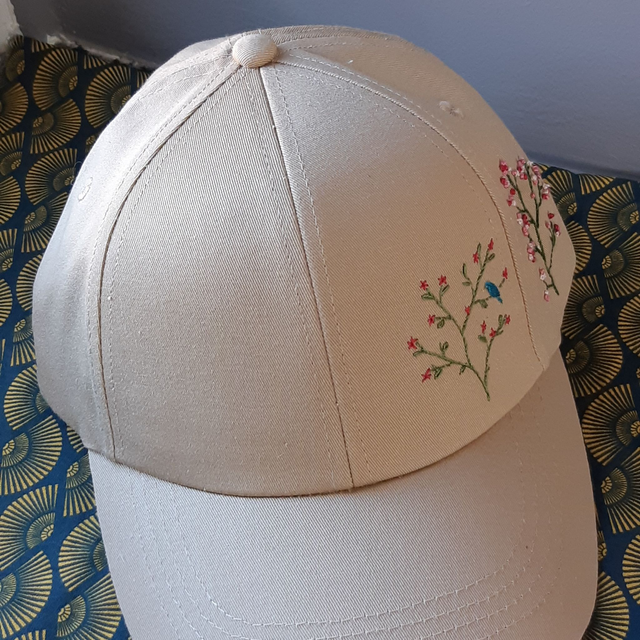 Casquette en coton beige brodée main représentant un jardin. Création originale Breudaira, pièce unique.